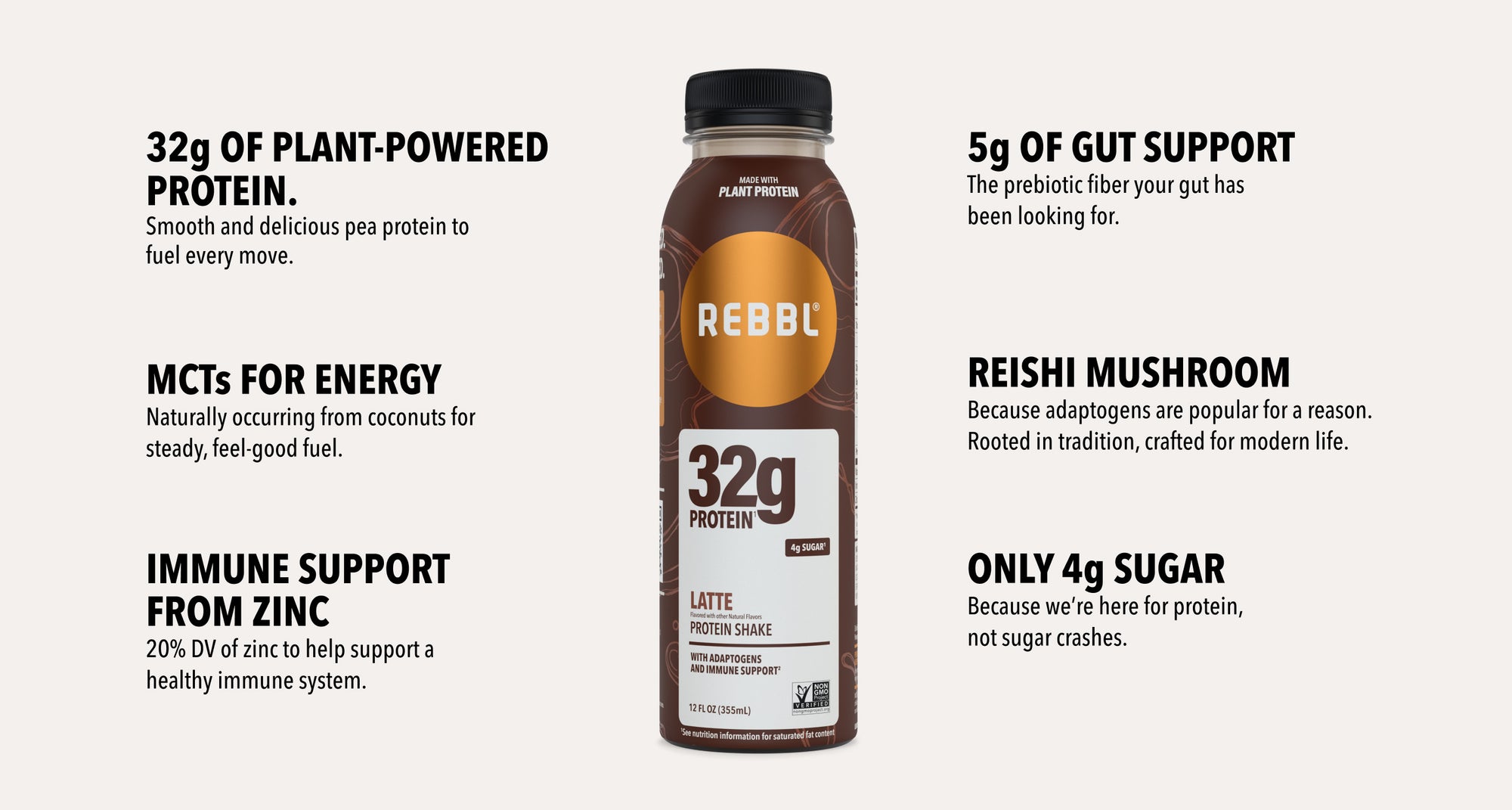 Introducing REBBL 32g Latte Protein, a deliciously smooth, plant-powered way to fuel every move. Crafted with pea protein, this indulgent shake delivers a sweet and creamy latte flavor that tastes like a treat but works like fuel, and with just 4 grams of sugar per bottle. With immune support from zinc, 5 grams of gut-loving prebiotic fiber, adaptogenic Reishi mushroom extract, and naturally occurring MCTs from coconut for steady, feel-good energy. This is next-level nourishment that redefines what a protein shake can be.