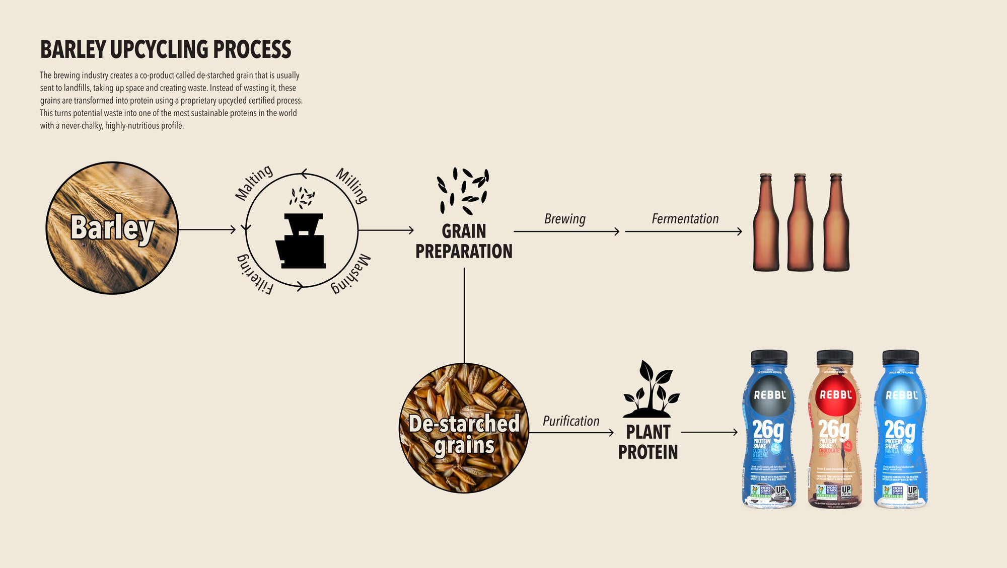 In our Upcycled Certified® protein shakes, barley that typically gets sent to landfills is upcycled and converted into a never-chalky nutritional blend with pea and rice protein. This allows us to reduce waste while creating a high-quality functional drink that is friendlier to the planet.