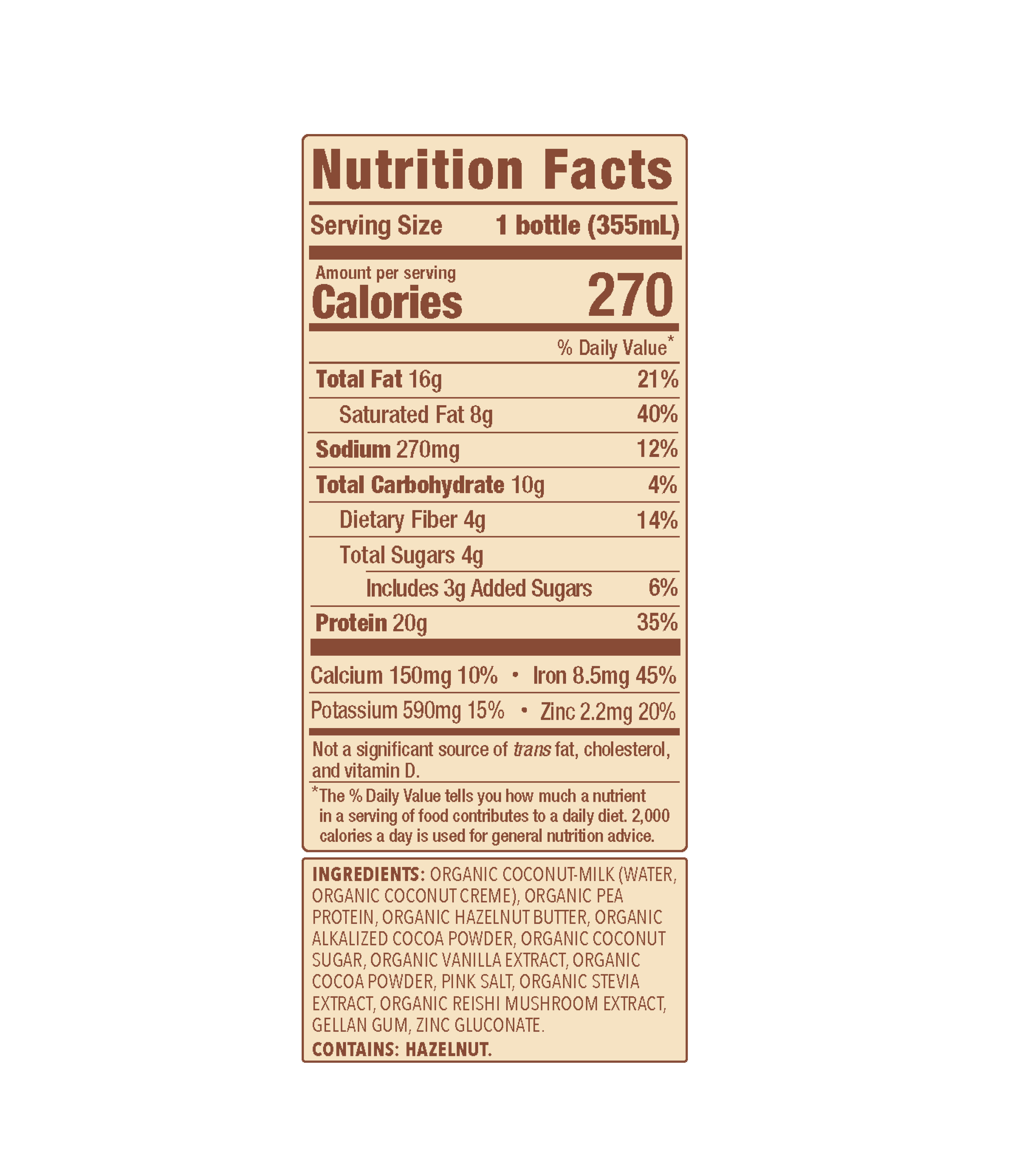• INGREDIENTS: ORGANIC COCONUT-MILK (WATER, ORGANIC COCONUT CREME), ORGANIC PEA PROTEIN, ORGANIC HAZELNUT BUTTER, ORGANIC ALKALIZED COCOA POWDER, ORGANIC COCONUT SUGAR, ORGANIC VANILLA EXTRACT, ORGANIC COCOA POWDER, PINK SALT, ORGANIC STEVIA EXTRACT, ORGANIC REISHI MUSHROOM EXTRACT, GELLAN GUM, ZINC GLUCONATE.